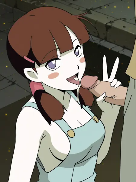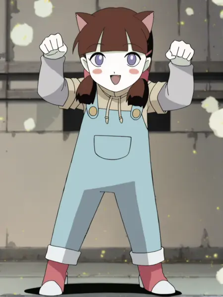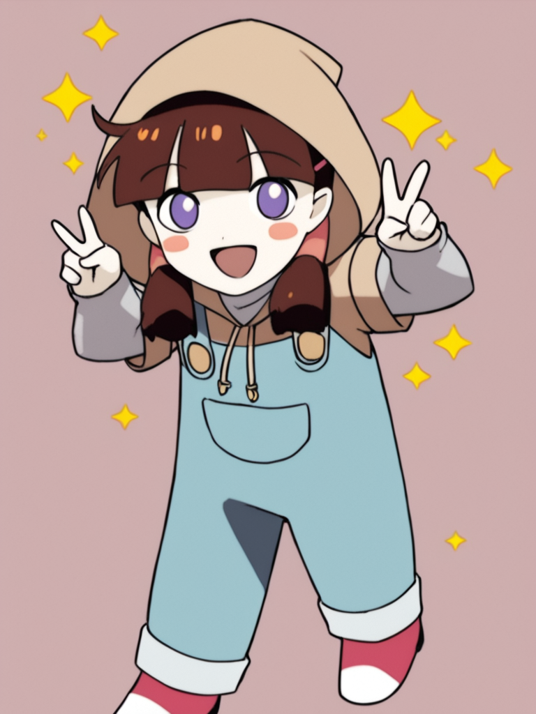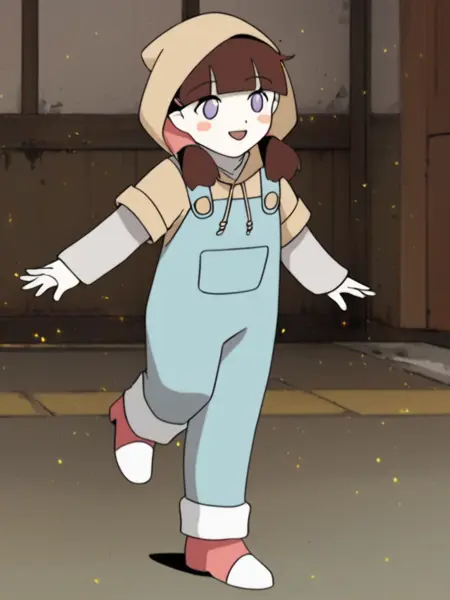 V1c Base prompt: tami_(the_big_o), pale skin, brown hair, blush stickers, purple eyes, twintails, hairclip, red white footwear, blue overalls, gray long sleeves, tan hoodie (plus hood up to add her hood)