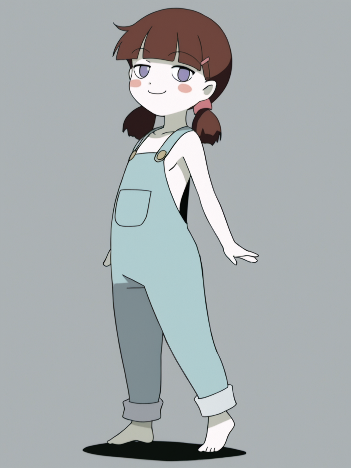 V0a Base prompt: tami_\(the_big_o\), pale skin, brown hair, blush stickers, purple eyes, twintails, hairclip, red white footwear, blue overalls, long sleeves