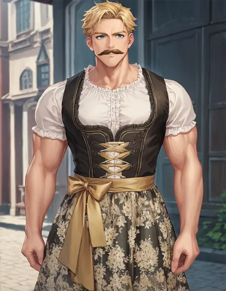 wearing dirndl dress 将生成随机可自定义的裙装;例如:wearing green dirndl dress, floral print, see-through