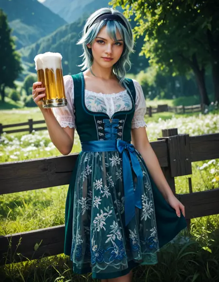 wearing COLOR OF YOUR CHOICE dirndl b4v4ri4n dress と入力すると、ご希望の色で一貫したドレスが生成されます。
