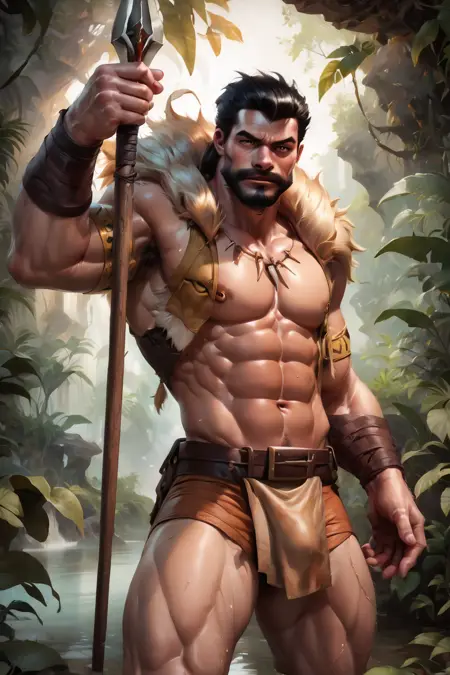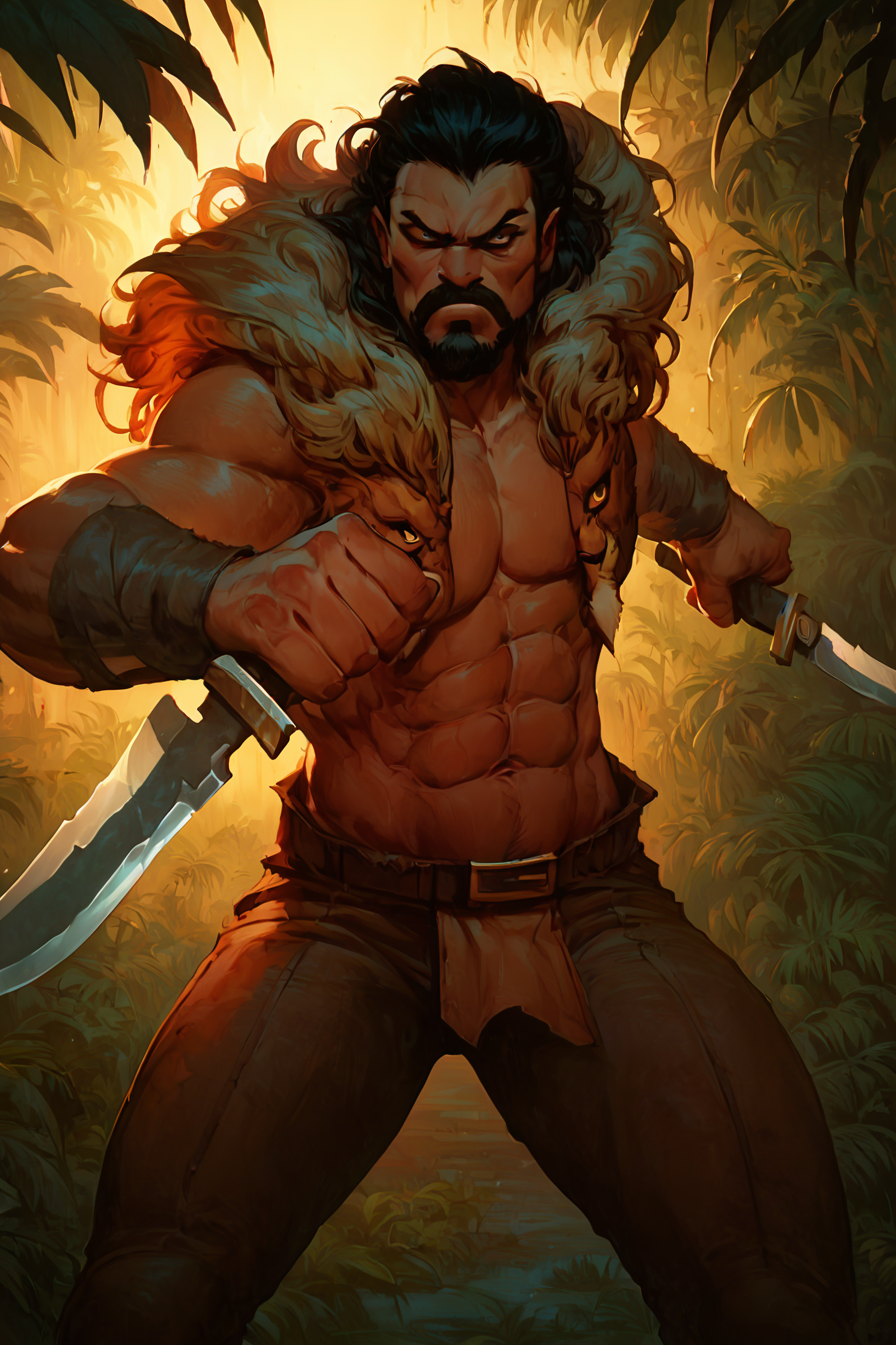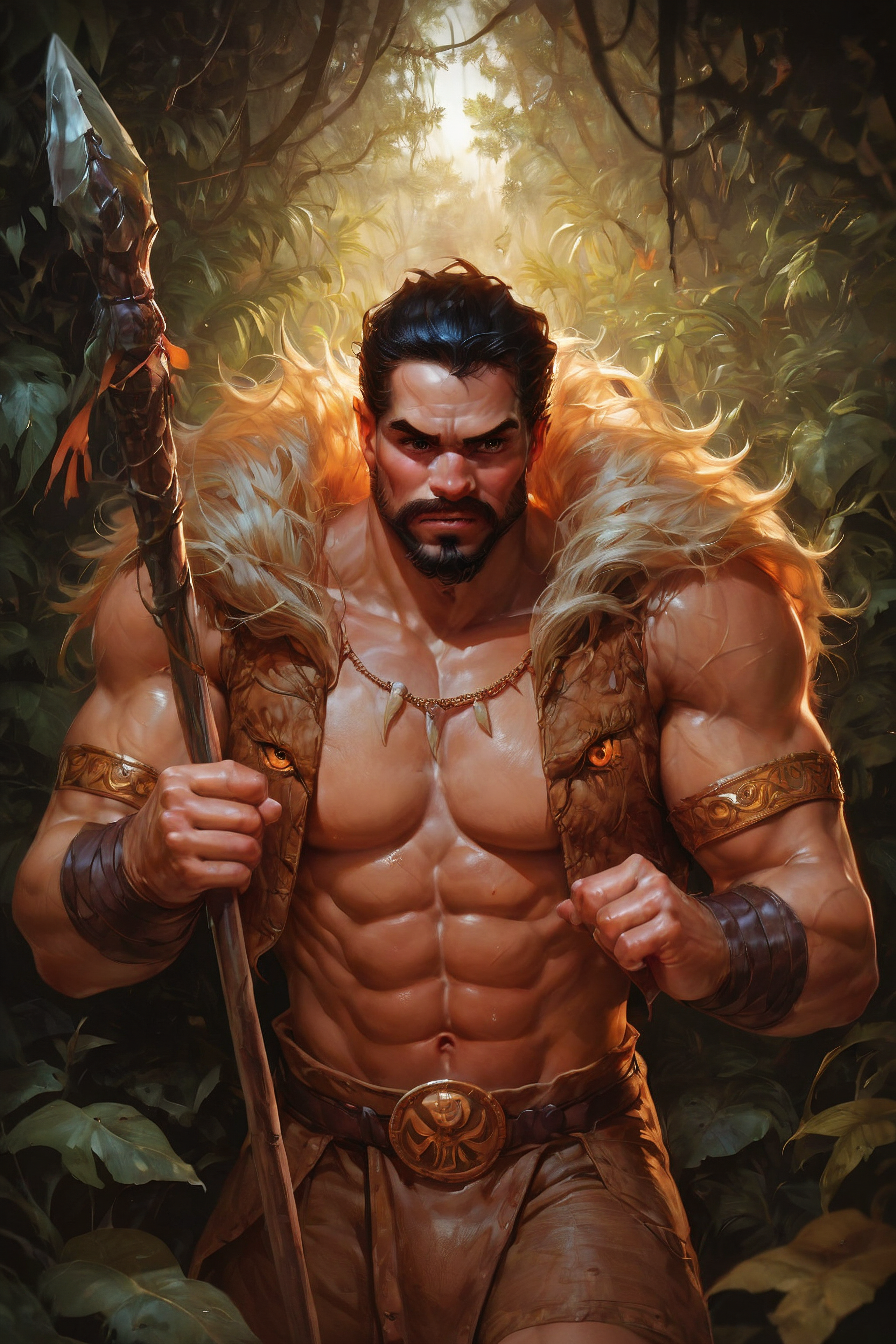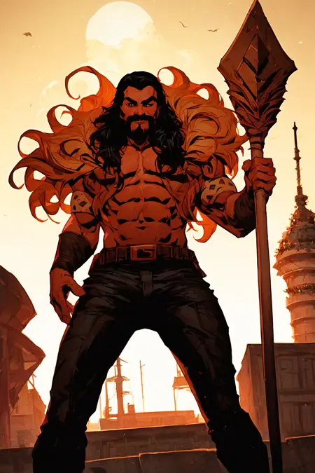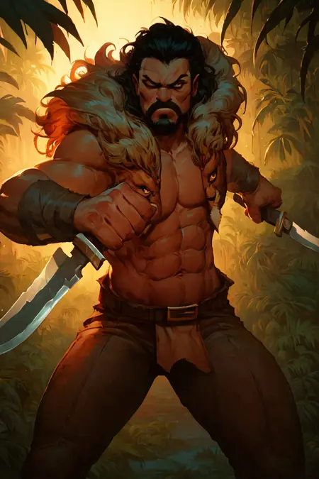 Triggerwords: aipansen_kraven, facial hair, lion mane collar, muscular, beard, black hair, abs, polearm