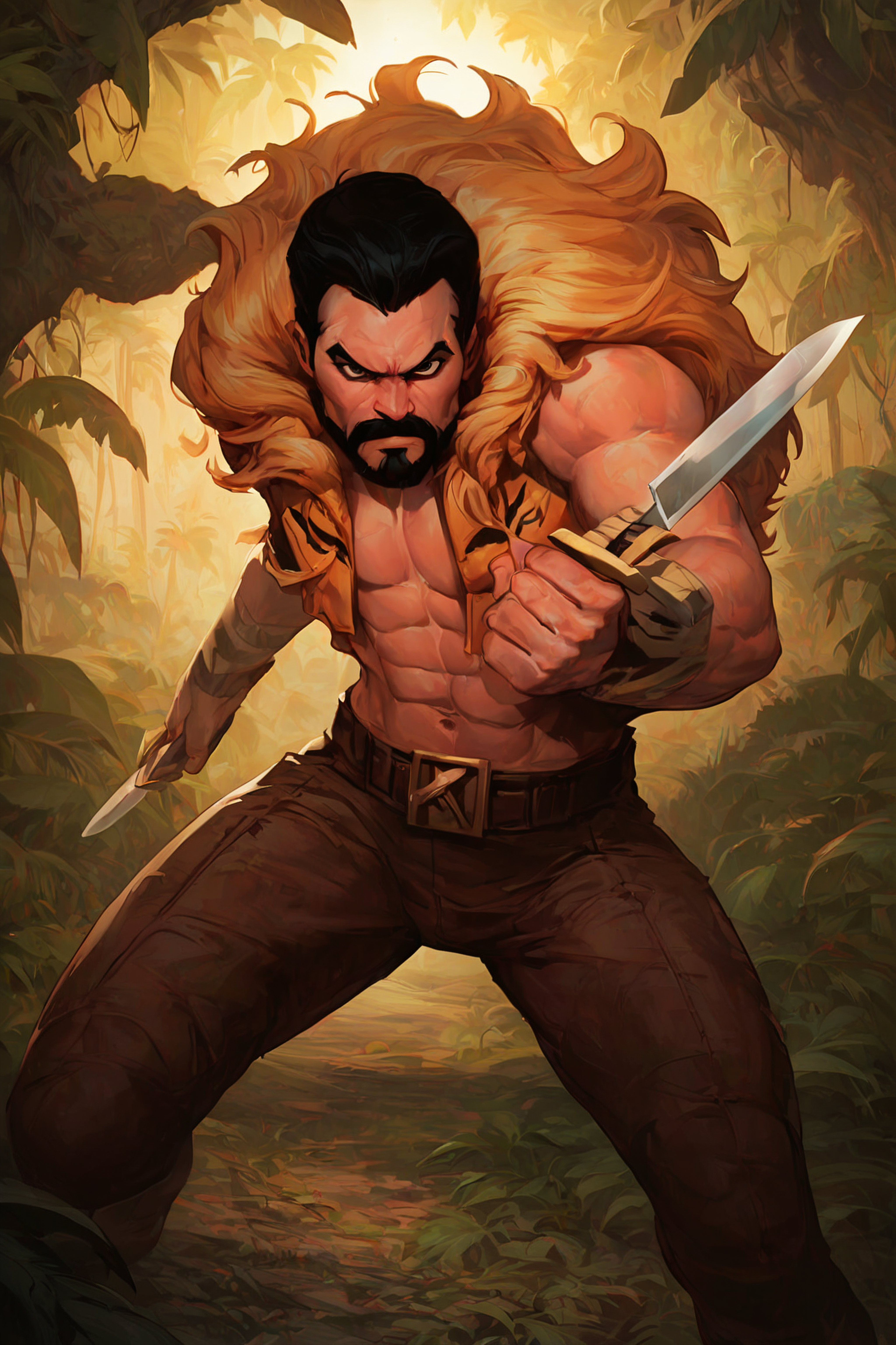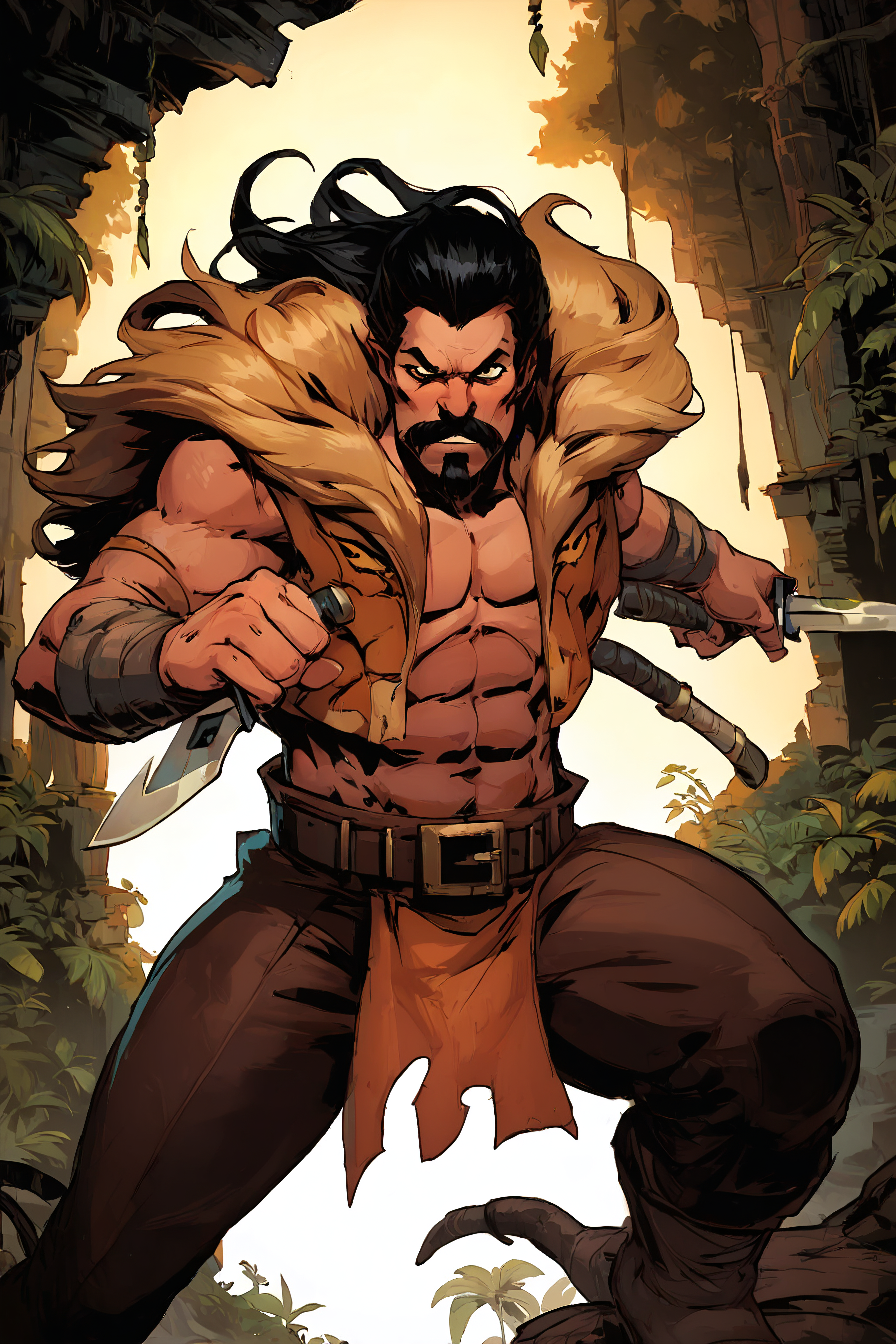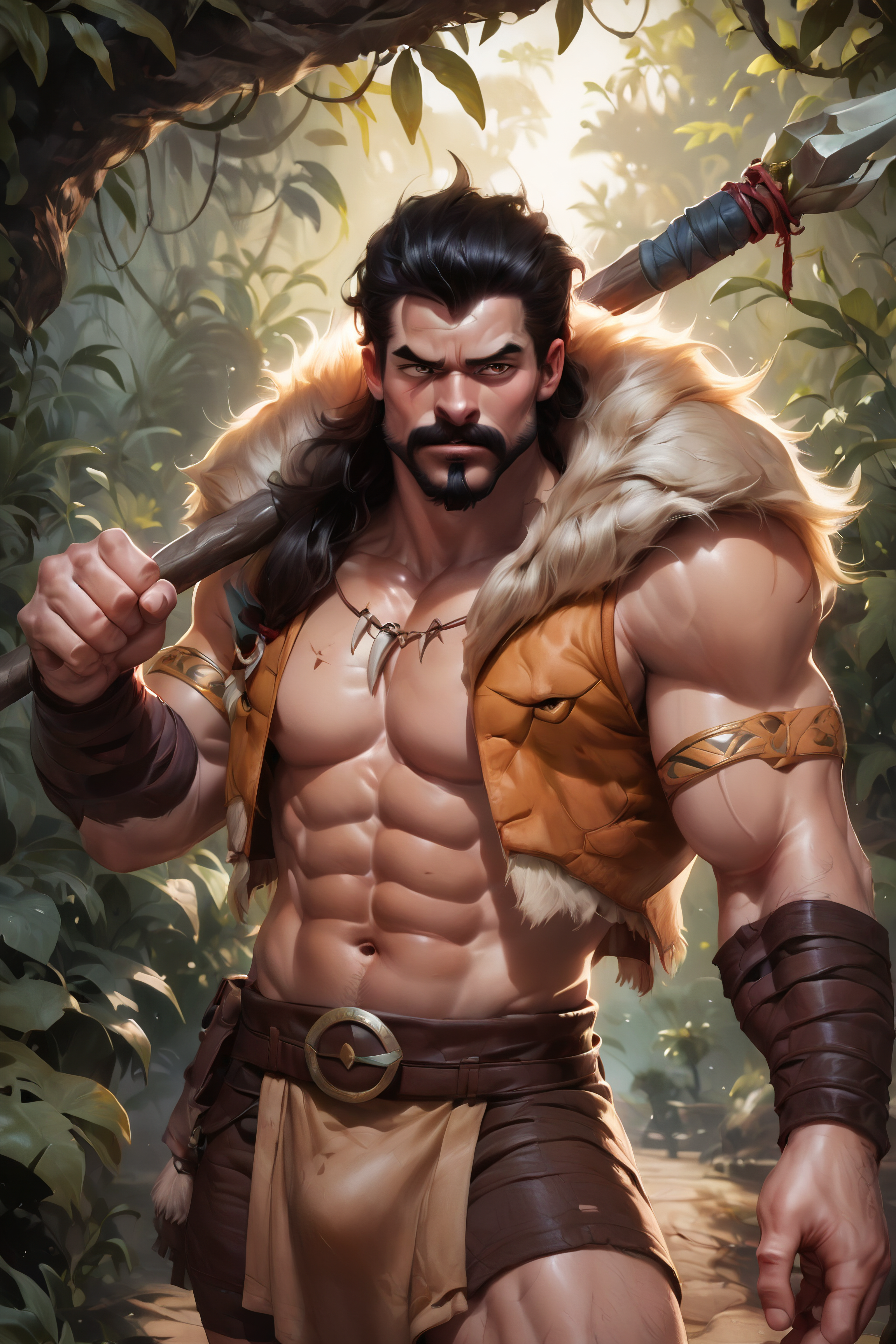 Triggerwords: aipansen_kraven, facial hair, lion mane collar, muscular, beard, black hair, abs, polearm