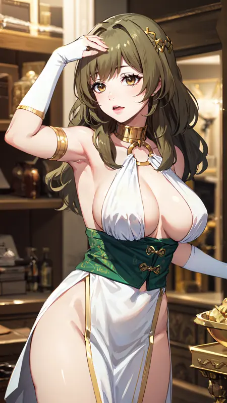 long hair, brown hair, brown eyes, gold choker, white dress, o-ring dress, armlets, hair accessories, white gloves, fingerless gloves