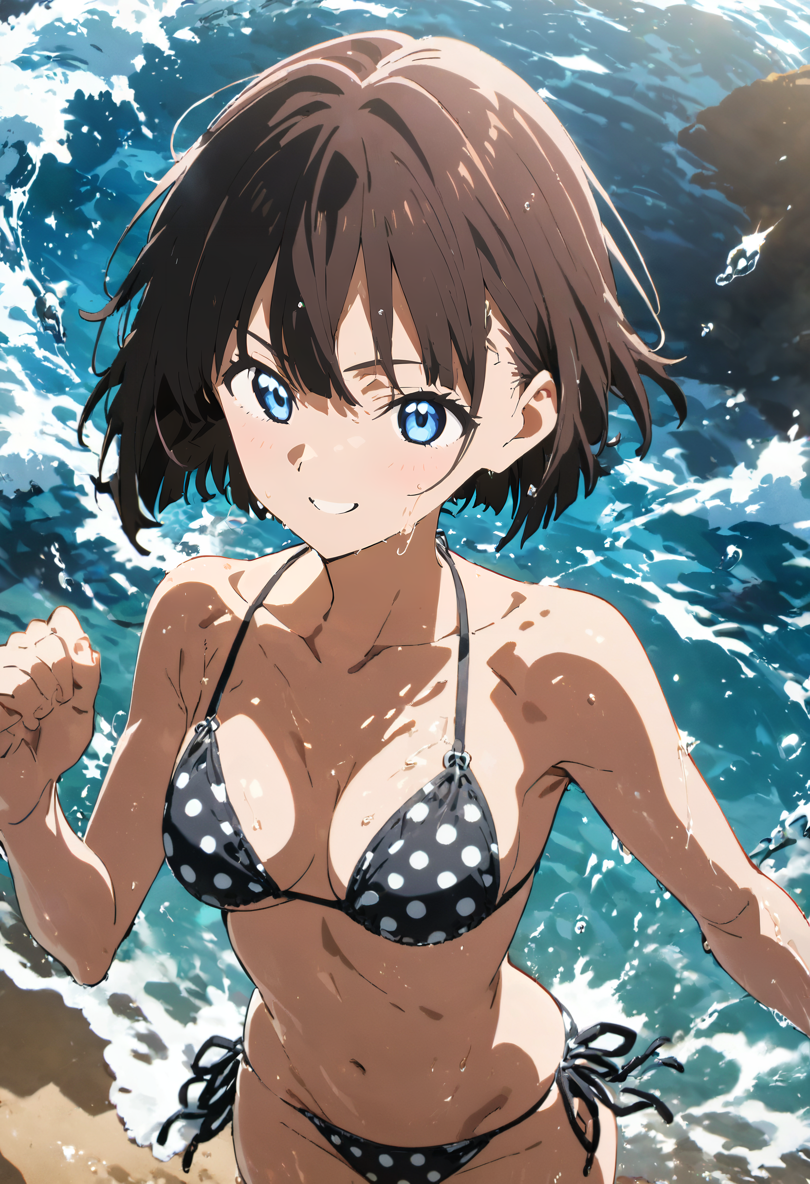 まやちゃんのお気に入りの水着を生成するには、black bikini, polka dot bikini, white polka dot を使用してください。