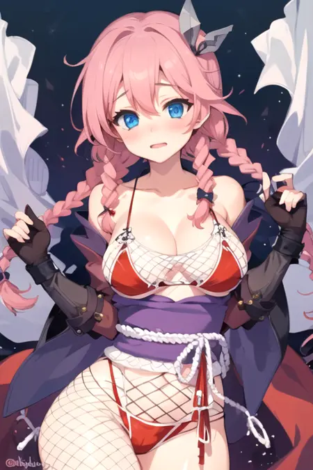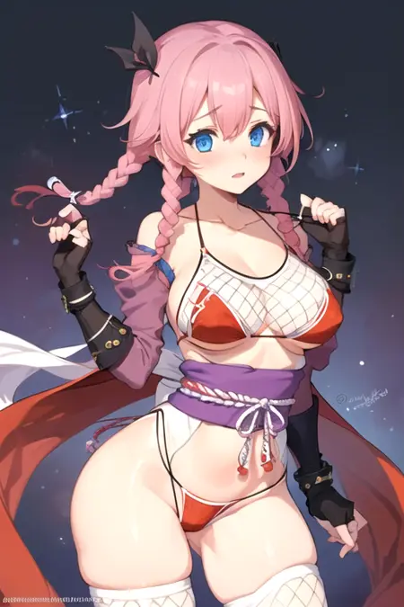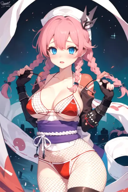 NonokaGlow, 1girl, solo, long hair, blue eyes, large breasts, hair ornament, thighhighs, fingerless gloves, cleavage, pink hair, twin braids, red bikini, sash, headband, obi, fishnet bodysuit