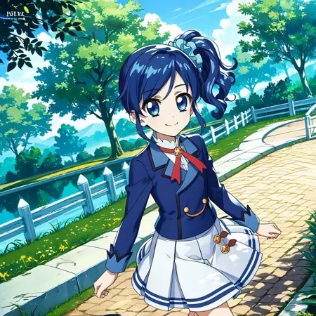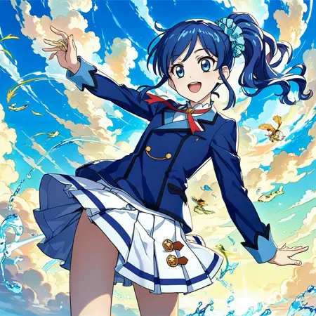 trigger: kiriya aoi, blue hair, blue eyes, side ponytail, long hair,hair scrunchie, blue scrunchie, starlight academy school uniform,blue jacket,white skirt, white footwear, knee boots,