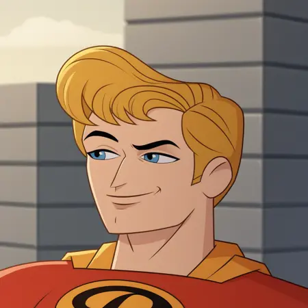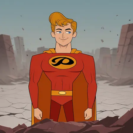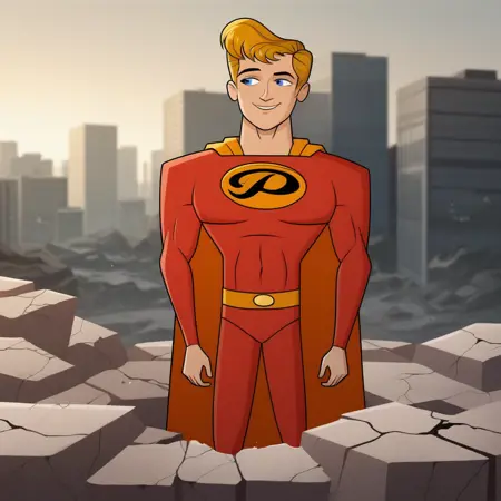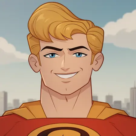 PerfectMan, 1boy, solo, blonde hair, blue eyes, superhero, cape,