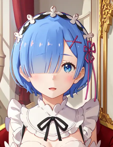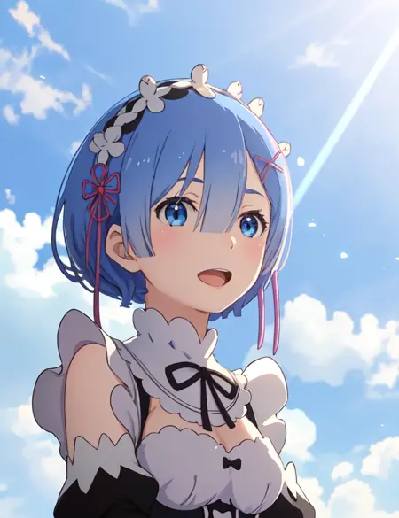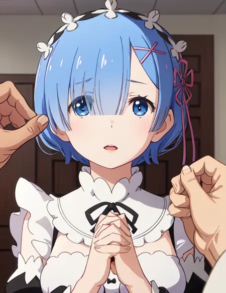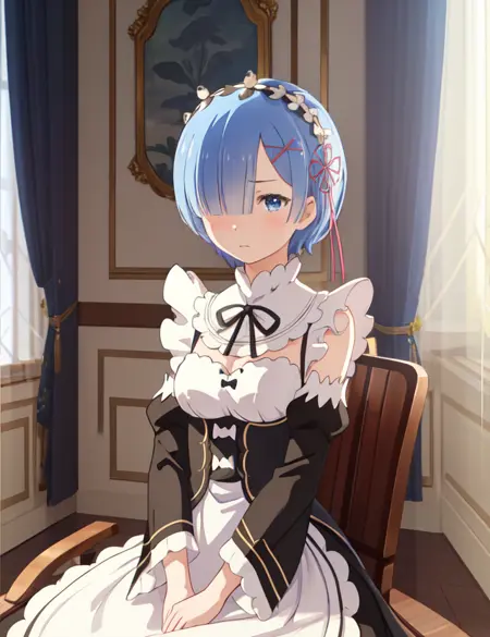 메이드: phRem, blue hair, 1girl, solo, roswaal mansion maid uniform, maid, detached sleeves