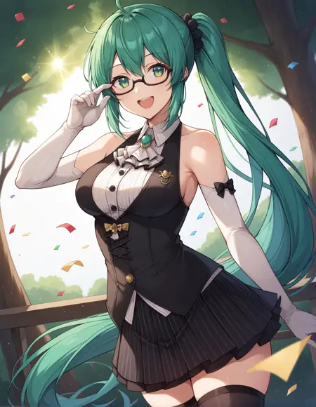 通常の衣装: ヘアスクンチ、黒いスクンチ、黒いリボン、黒枠の眼鏡、白シャツ、カラー付きシャツ、ドレッシーシャツ、ノースリーブ、黒いベスト、肩出し、ブローチ、ジュエリー、白いアスコット、肘まで手袋、白い手袋、黒いスカート、縞模様のスカート、プリーツスカート、黒い太ももハイズ