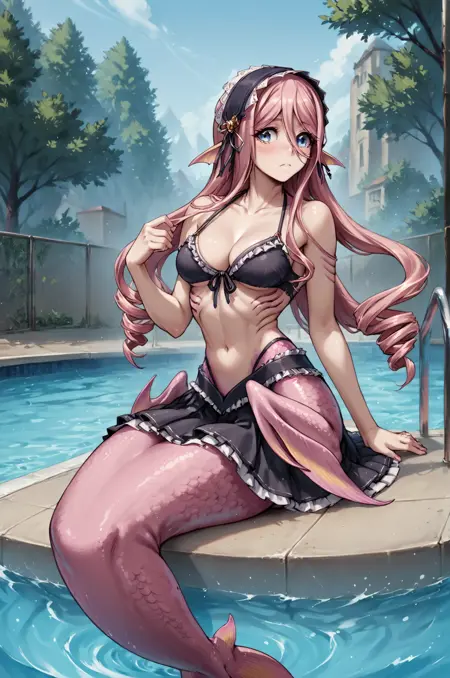 水着用のプロンプト例:meroune_lorelei, headdress, pink_hair, drill_hair, sitting, pool, monster_girl, scales, gills, bikini, bikini_skirt, (flippers:1.2), mermaid,