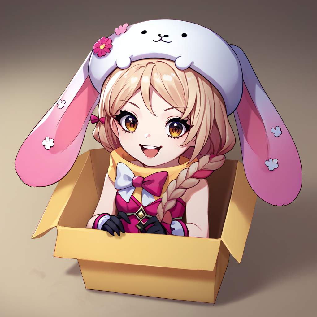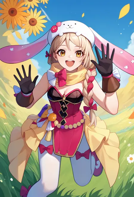 봄 팬걸: frammespring, 금발, 단일 땋은 머리, 동물 모자, 토끼 모자, 분홍색 드레스, 스트랩 없는 드레스, 검은 장갑, 흰색 팬티스타킹, 노란색 스카프, 리본, 어깨 드러남, 가슴 노출