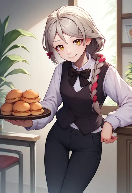 기본 복장: frammedef, 다채로운 머리카락, 회색 머리카락, 단일 땋은 머리, 갈색 헤드웨어, 체크 무늬 헤드웨어, 모자, 모자 리본, 분홍색 리본, 분홍색 드레스, 어깨가 드러난 드레스, 검은 장갑, 검은 숏팬츠, 자전거 숏팬츠, 검은 허벅지 양말, 갈색 스카프, 어깨 드러남