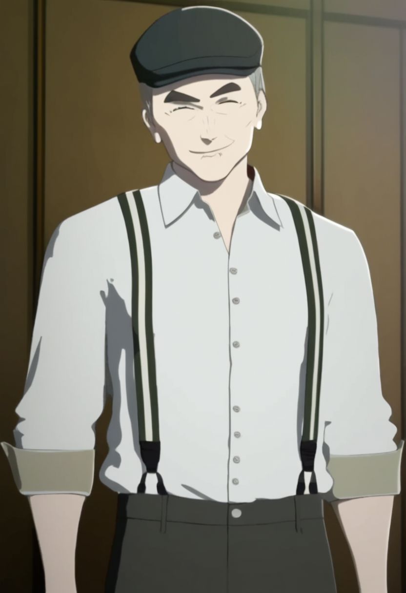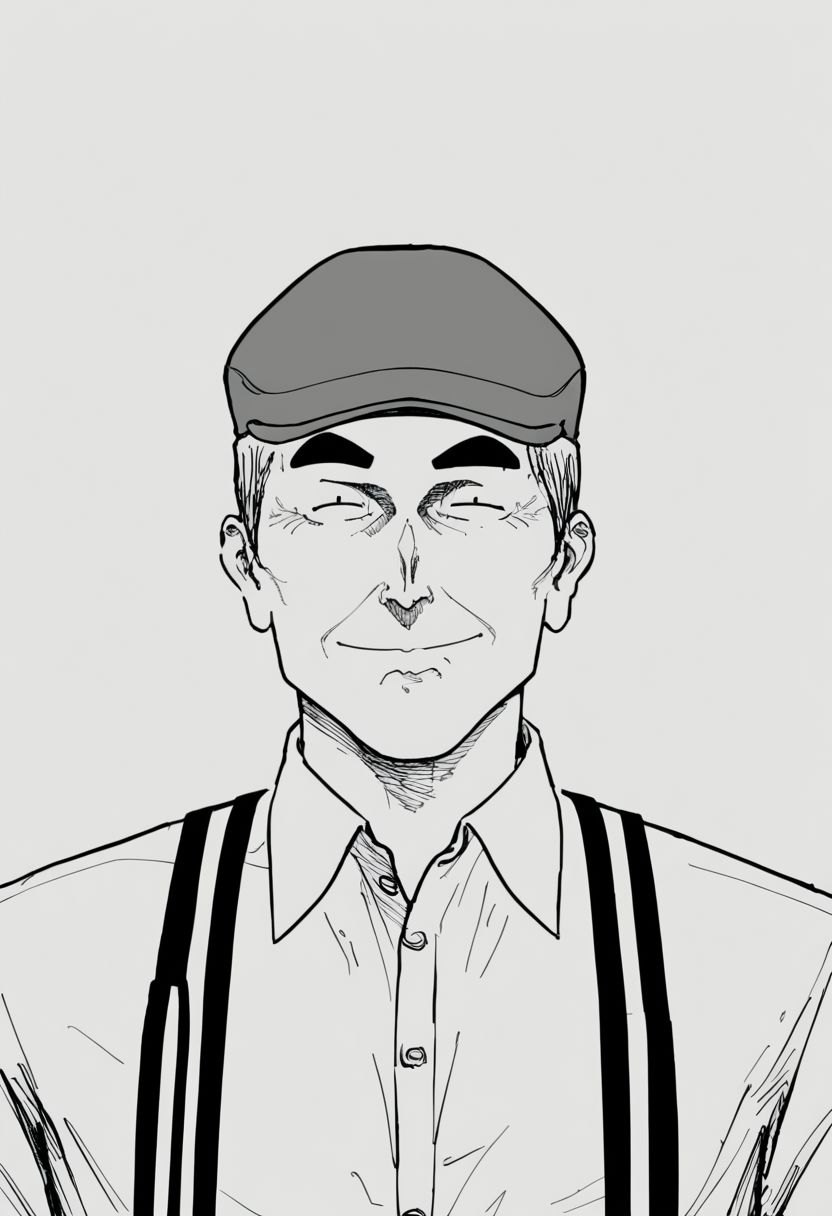 Sato, scaly cap, hat, suspenders, eyes closed, thick eyebrows, old man, white hair