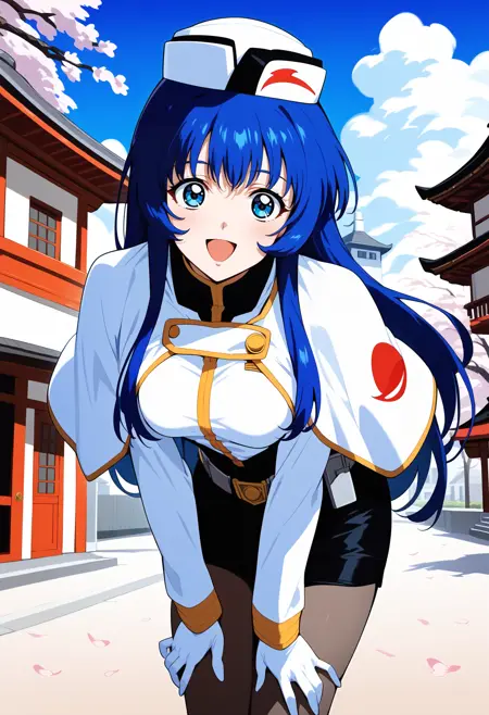 outfit1aayurika, long hair, blue eyes, garrison cap, white headwear, breasts, uniform, white capelet, long sleeves, white gloves, belt, black skirt, pantyhose