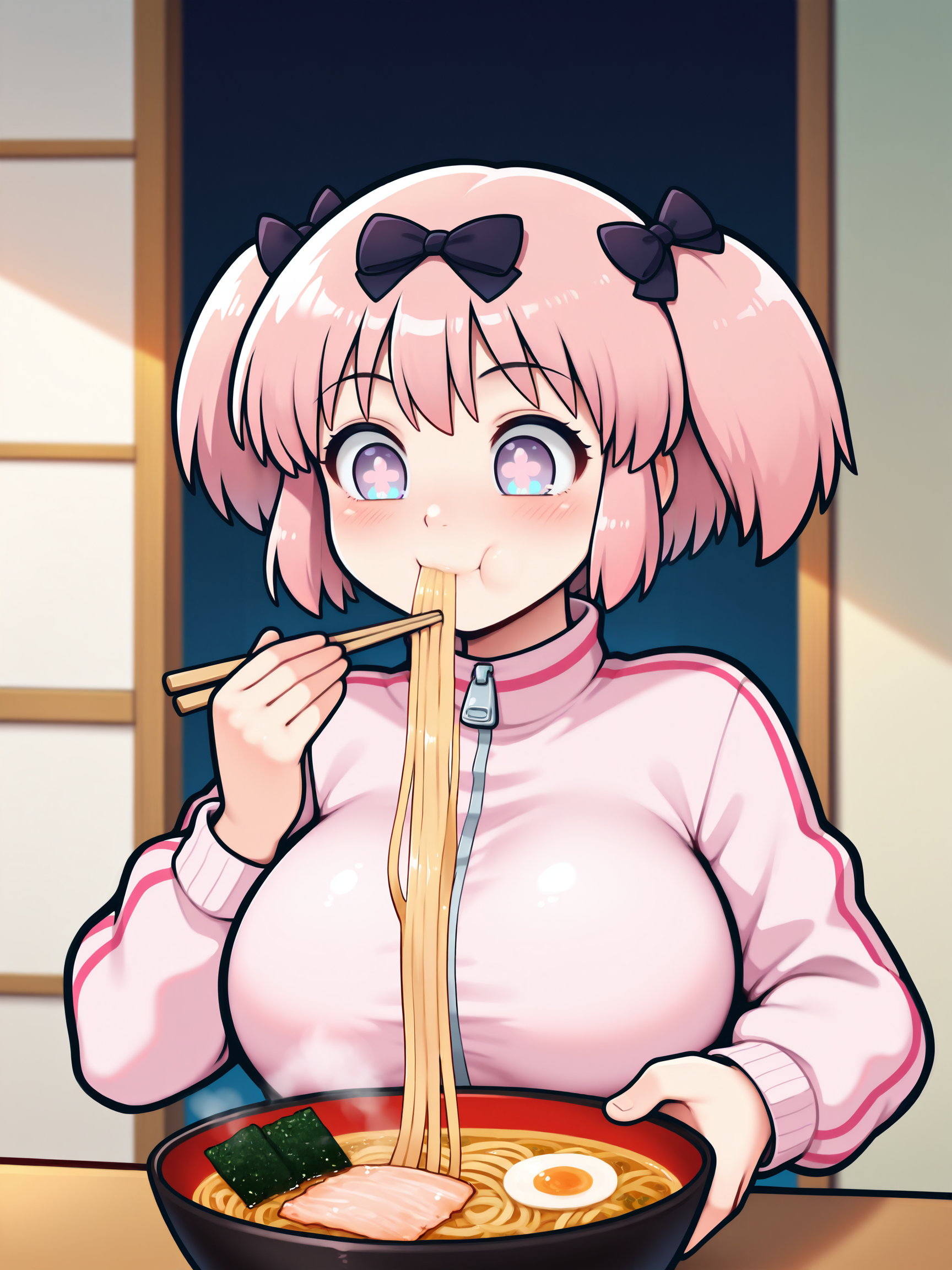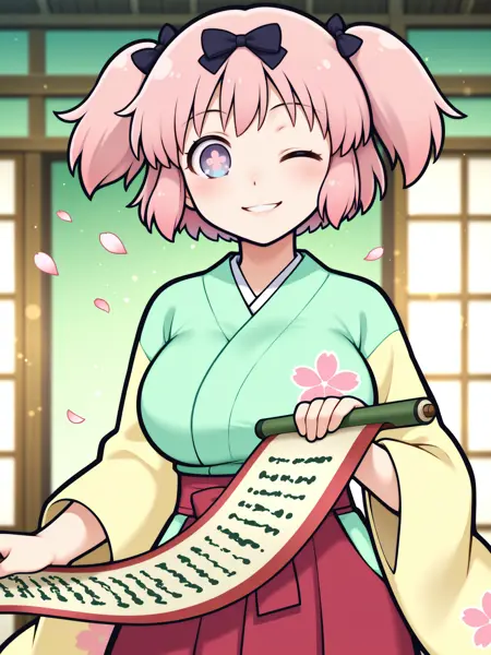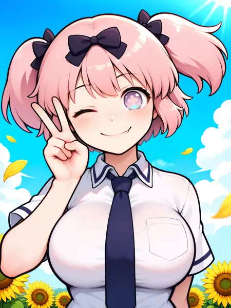 LoRA의 트리거 단어는 **"Hibari_IL, 보라색 눈, 십자형 동공, 분홍색 단발, 짧은 트윈테일, 검은색 머리장식, 큰 가슴"**입니다.