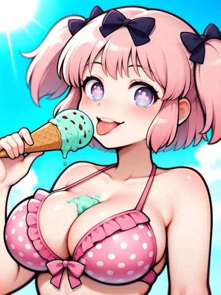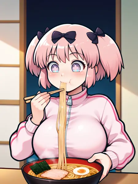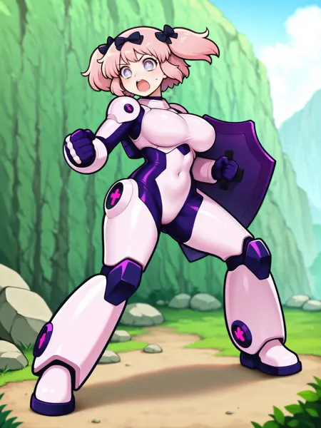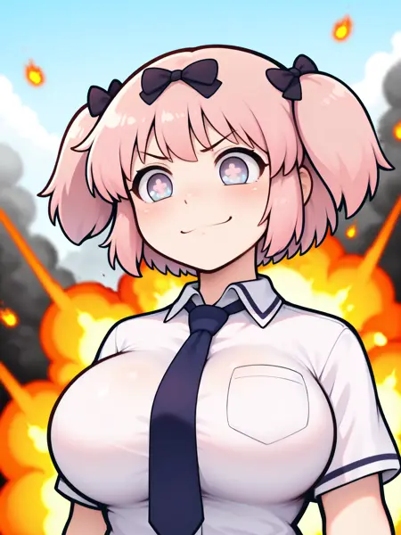LoRAのトリガー語は**"Hibari_XL, 紫色の目, 十字型の瞳孔, ピンクの短い髪, 短いツインテール, 黒い髪飾り, 大きな胸"**です。