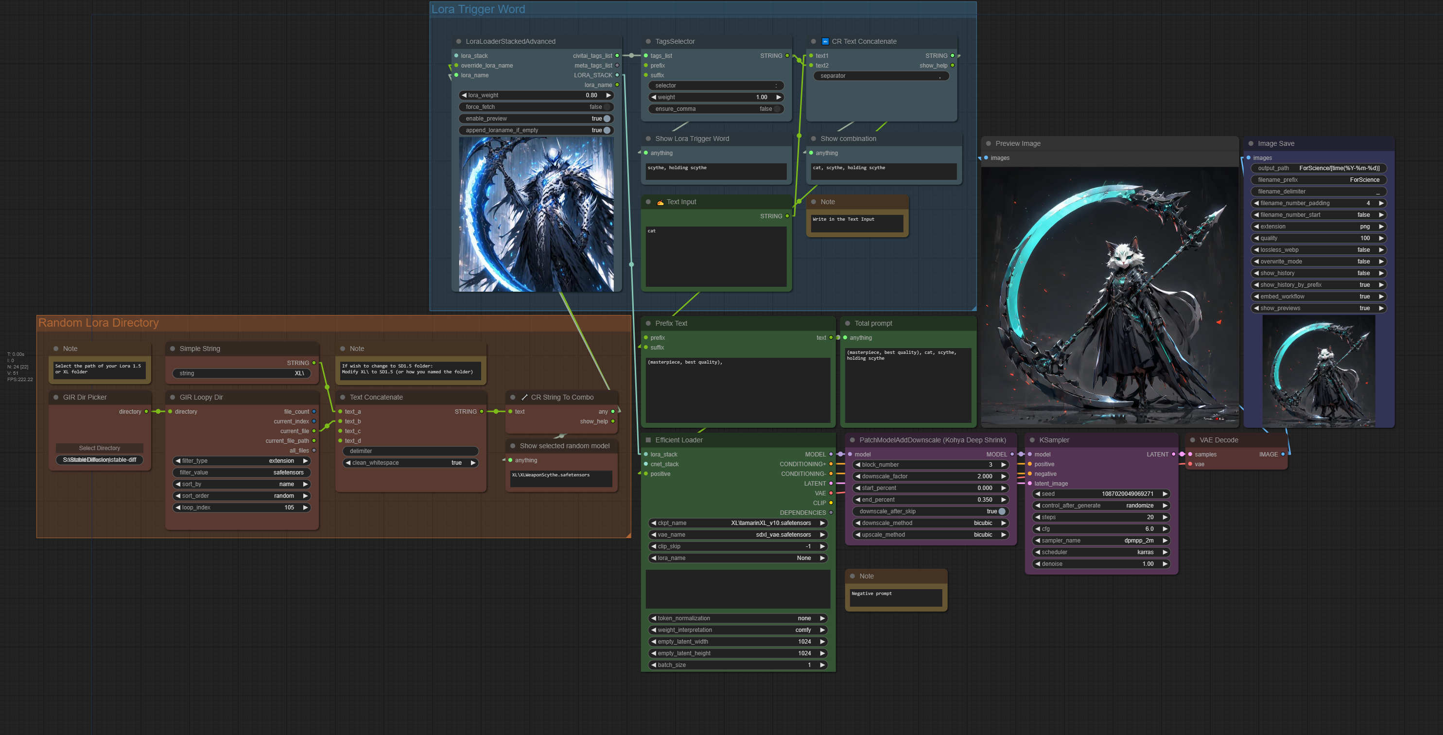 이 워크플로우가 바로 당신을 위한 것입니다! 원하는 폴더에서 랜덤 LoRA를 선택하고 스타일을 활성화하기 위한 트리거 단어를 자동으로 추가합니다.
