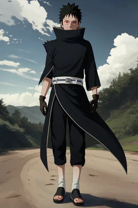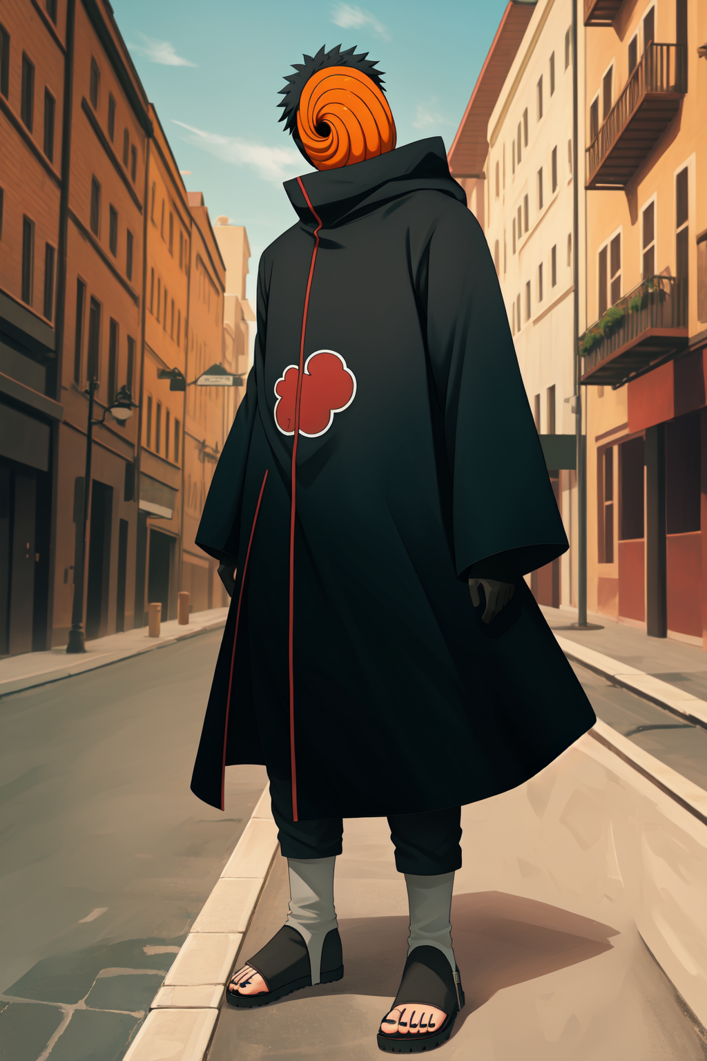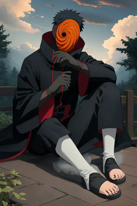 tobi, 1boy, mask, high collared, black coat, black cloak, black gloves, sandals, toeless footwear