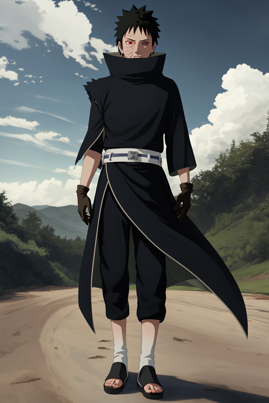 obito uchiha, 1boy, belt, black gloves, sandals, toeless footwear