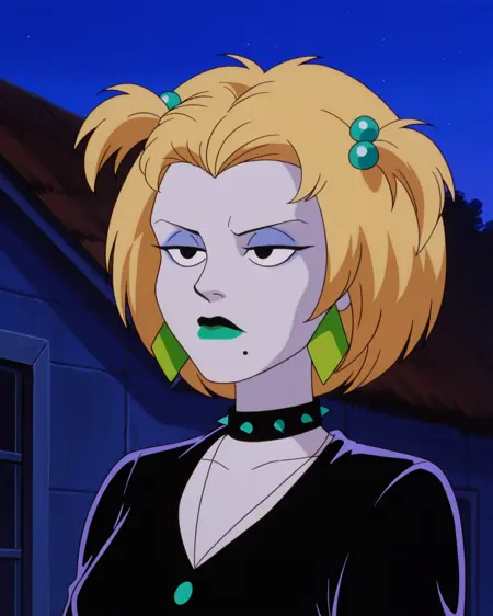 Duskhex、緑のリップ、眉なし、緑のイヤリング、ゴスファッション、金髪