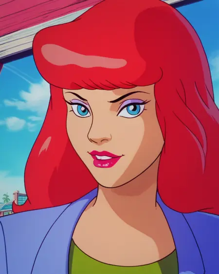 DaphneBlake, red lips, red hair, blue eyes, skirt, jacket