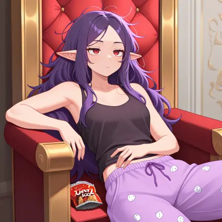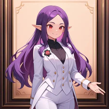 Optional: red eyes, pointy ears, long hair, purple hair, white elbow gloves, purple dress, white skirt, white cape, tiara