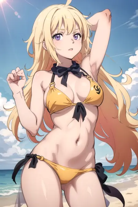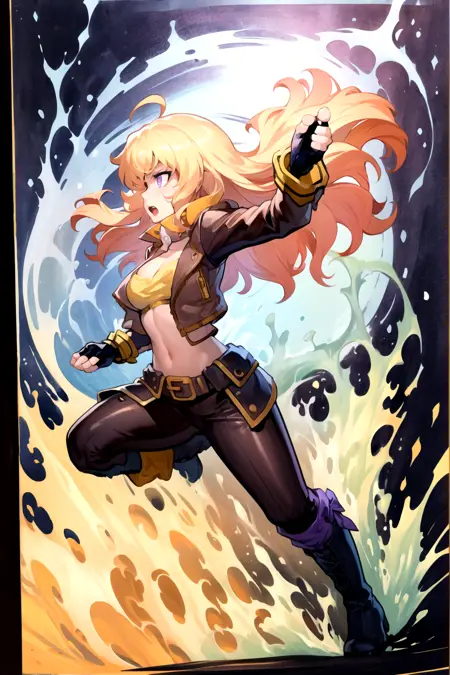 其他提示:义肢手臂,呆毛,紫色眼睛,棕色夹克,肚脐,乳沟,无指手套,靴子,腰带
