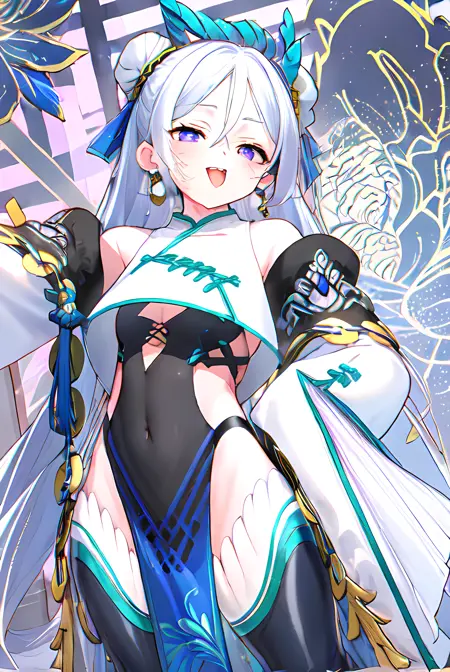 pavonis, chinese_clothes, dress, earrings, jewelry, long_hair, looking_at_viewer, off_shoulder, underboob, purple_eyes, solo, thighhighs, white_hair, double_bun, long_sleeves, wide_sleeves