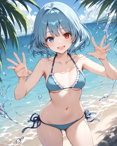 recommend: tatara kogasa, short hair, blue hair, bangs, heterochromia, red eyes, blue eyes,