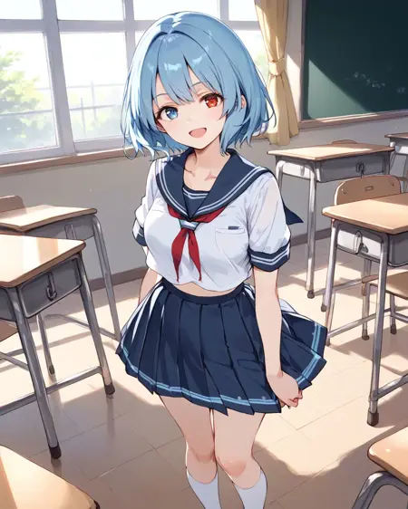 의상 강화: 흰 셔츠, 긴 소매, 줄리엣 소매, 조끼, 파란 조끼, 치마, 파란 치마, 양말 없음, 게타,