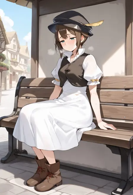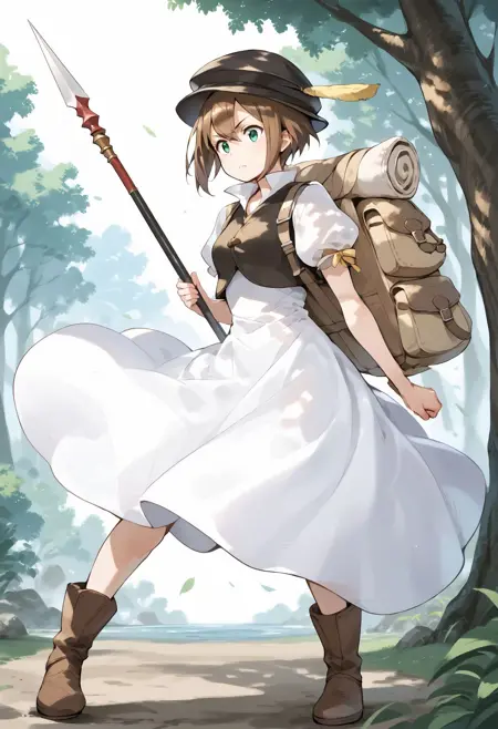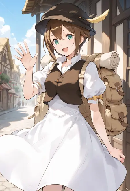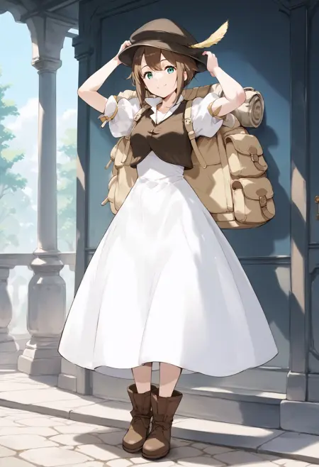 彼女の典型的な外見には「hat,hat feather,backpack,vest,dress,boots」を追加してください。