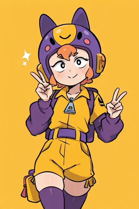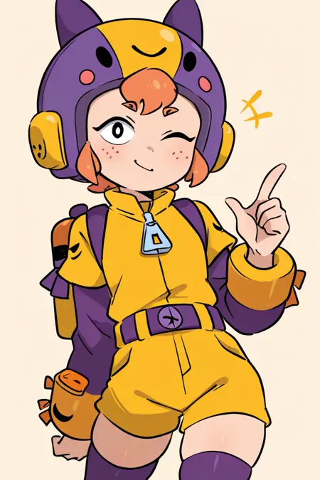 1 girl, bsbea,orange hair, short hair, helmet, yellow shirt,purple sleeves, belt, zipper, fringe, long stockings,yellow shorts