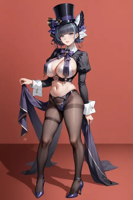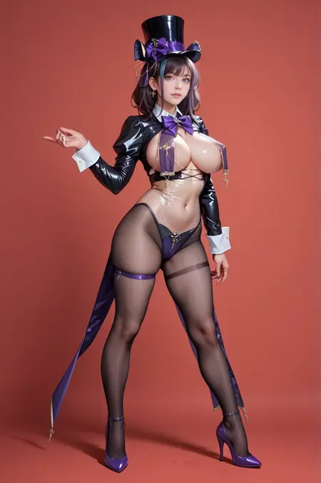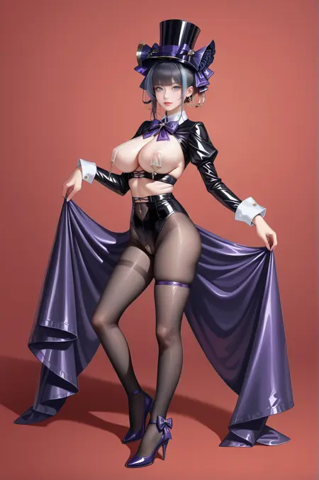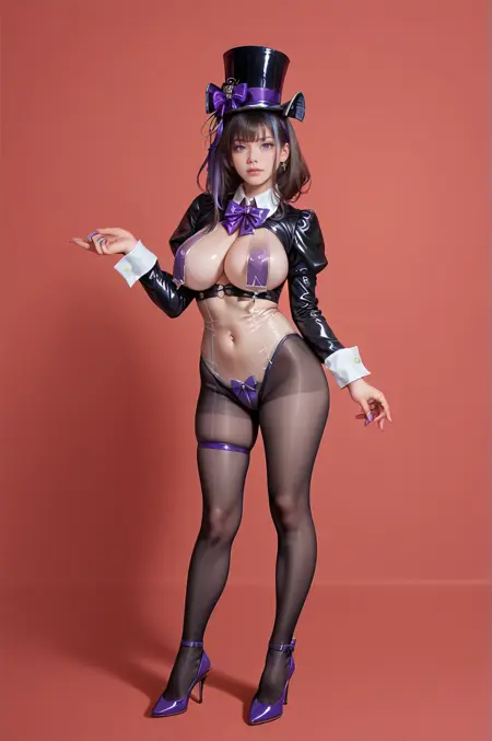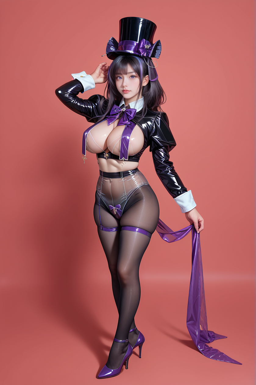 black jacket,crop top,breast curtains,see-through,purple bow,purple ribbon,top hat,pantyhose,latex