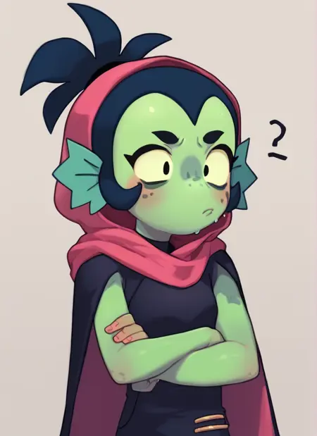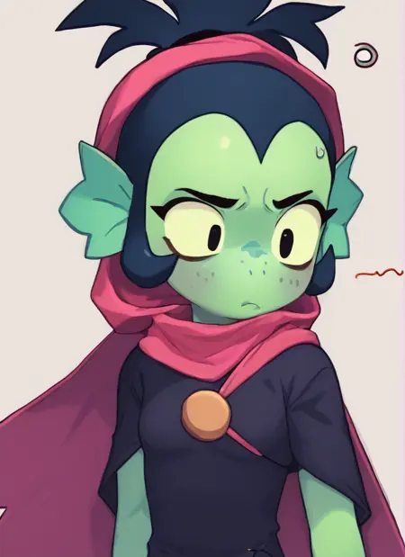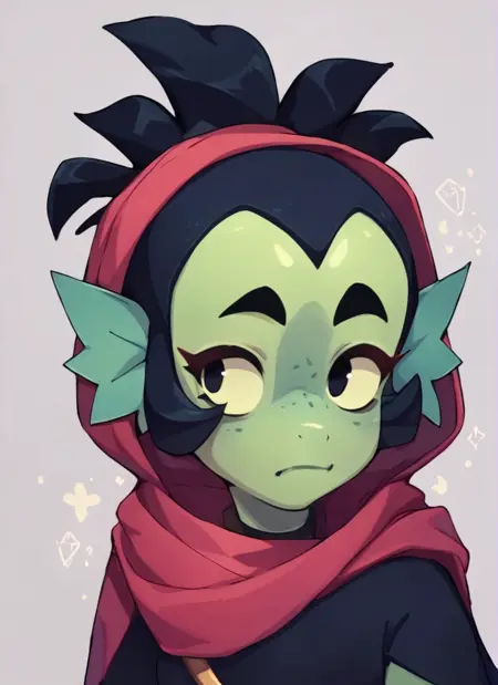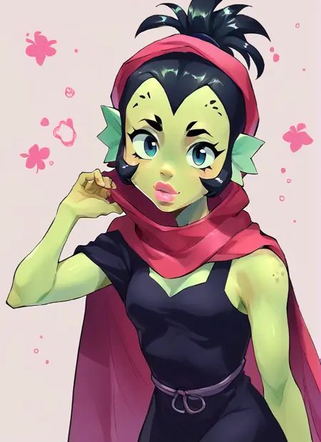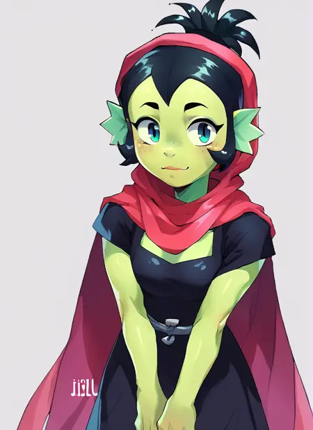 bswillow , 1girl, solo , red scarf, green skin ,cape, ,black dress, black hair,