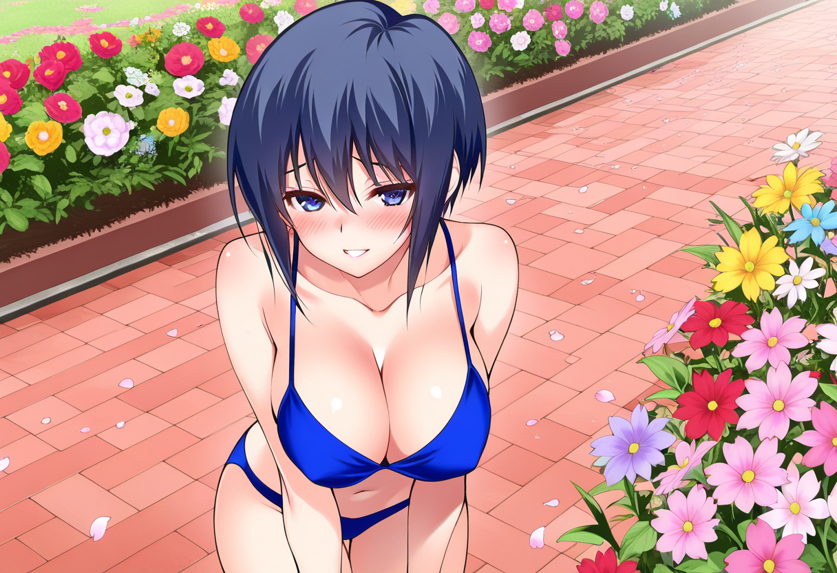 梦崎春姆,深蓝色头发,短波波头,遮眼刘海,深青色眼睛,胸部露出,