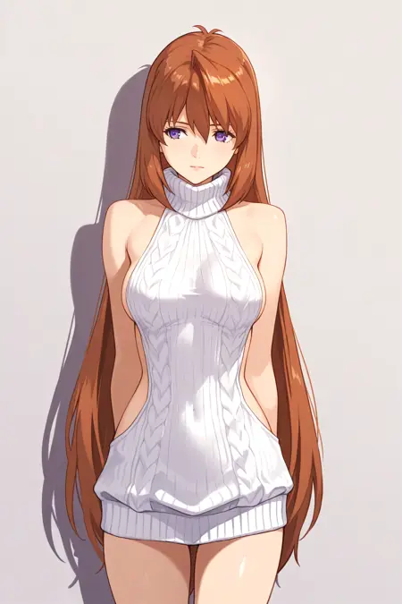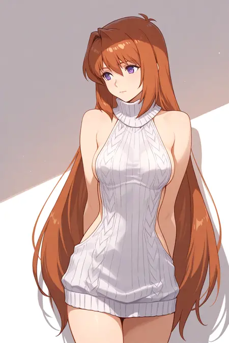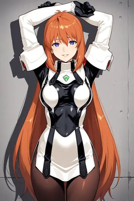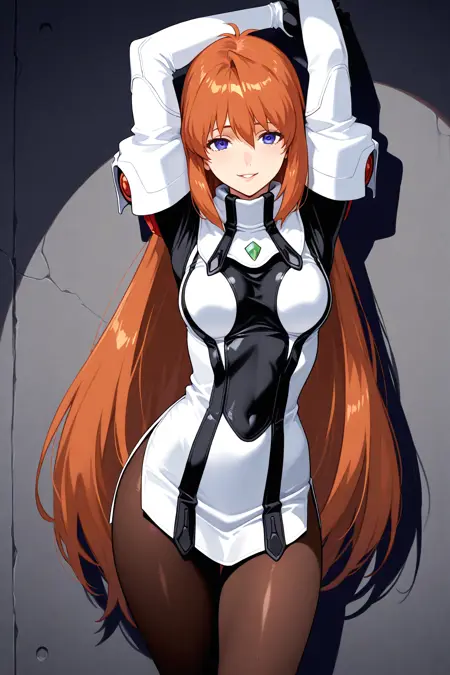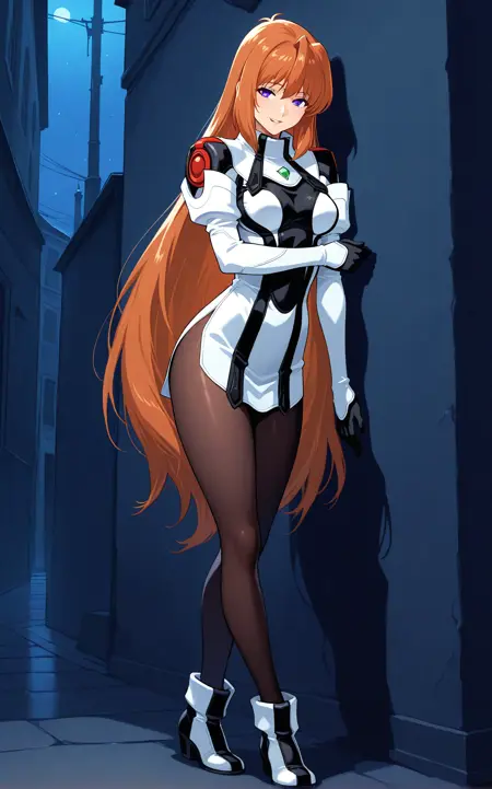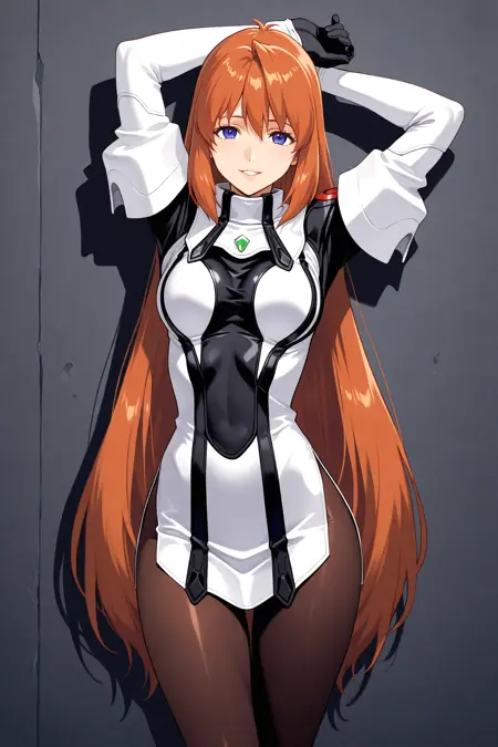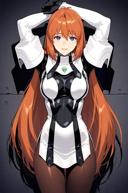 IllustriousXLのアクティベーションタグは「elhaym_van_houten, 1girl, very long hair, orange hair, medium breasts, blue eyes,」、衣装タグは「originaloutfit, pantyhose, gloves, uniform, short dress, dress, black pantyhose, boots,」。