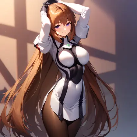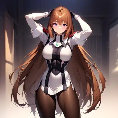 Activation tag for Animagine is "elhaym_van_houten", appearance tag is "brown hair, purple eyes, very long hair," and outfit tag is "originaloutfit, pantyhose, long hair, gloves, uniform, breasts, dress, "