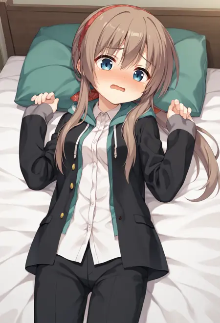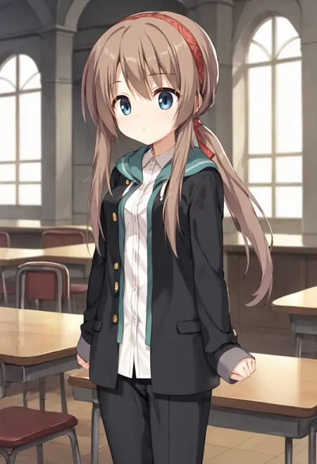 tsumugi-default, blue eyes, brown hair, low ponytail, long hair, hairband, black jacket, white shirt, dress shirt, (black pants:1.1), loafers