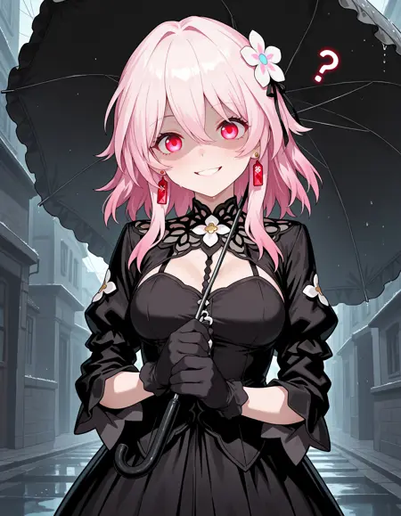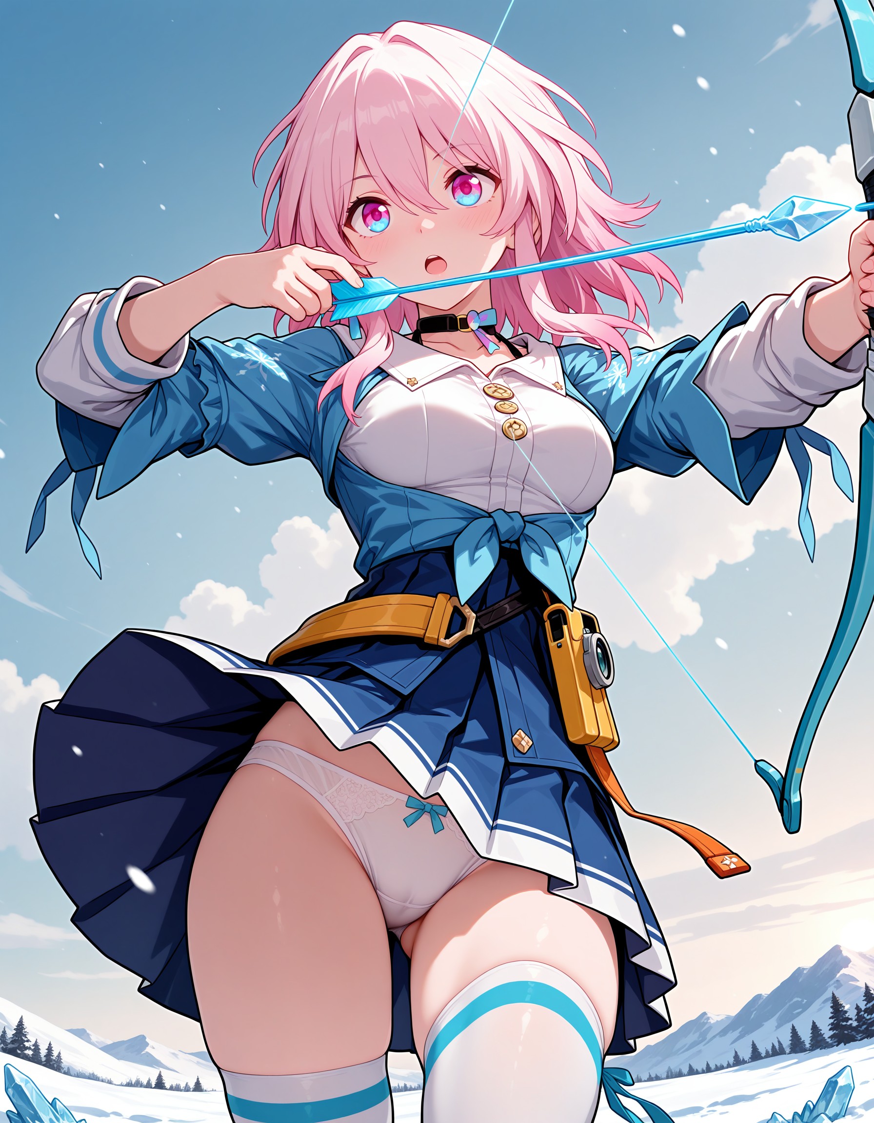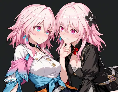 m7th, pink hair, medium hair, medium breasts, pink eyes, blue eyes