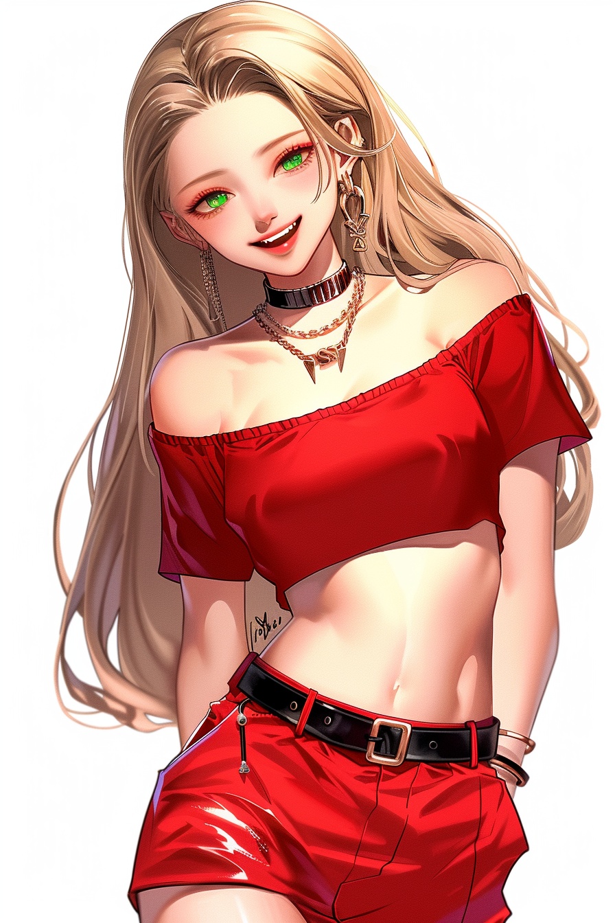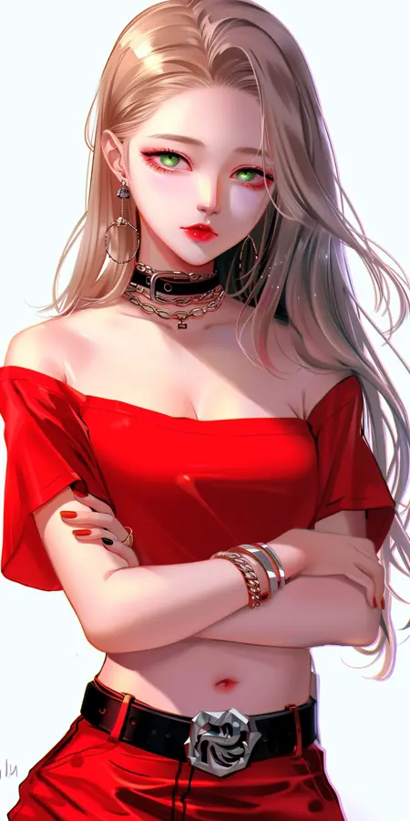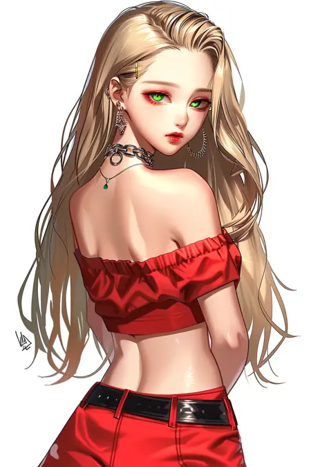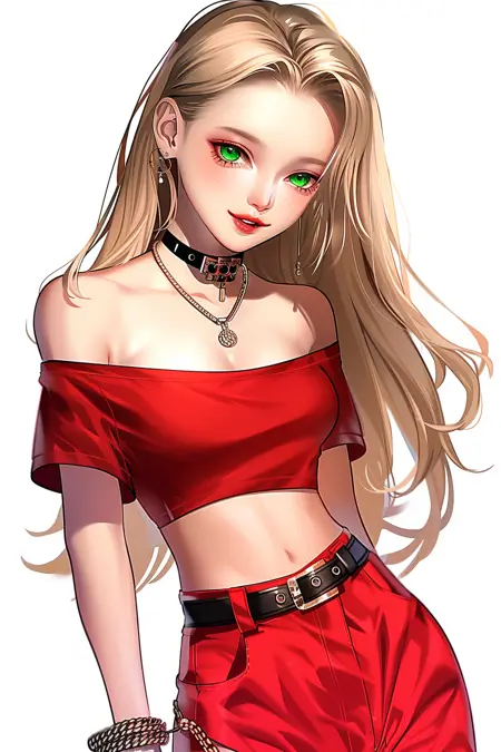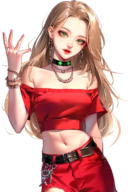 Adarel, blonde hair, straight hair, very long hair, green eyes, red cropped t-shirt, red skirt, slender body, gorgeous