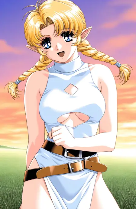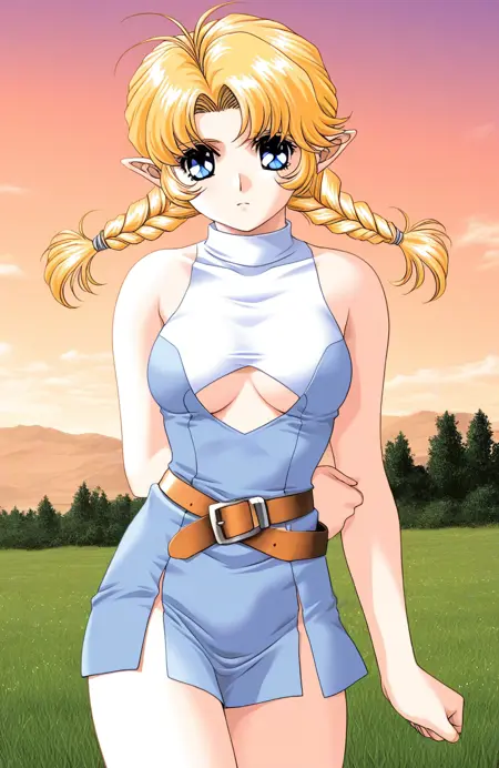 YU-NO(OVA), 1girl, solo, blonde hair, medium breasts, blue eyes, twin braids, pointy ears, long hair,