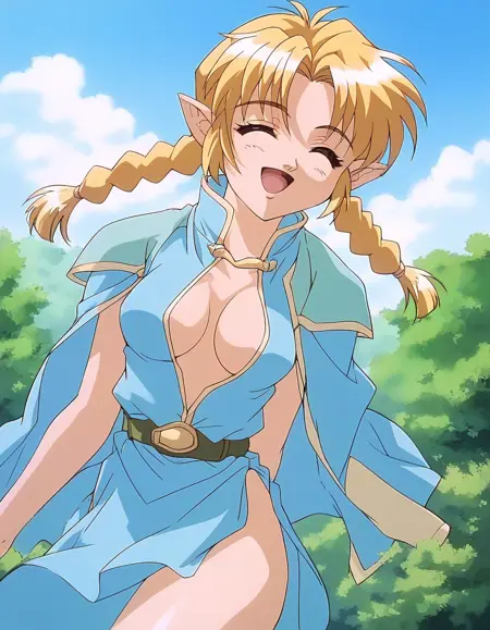YU-NO(OVA), 1girl, solo, blonde hair, medium breasts, blue eyes, twin braids, pointy ears, long hair,