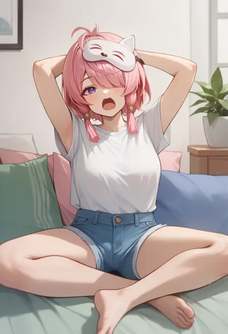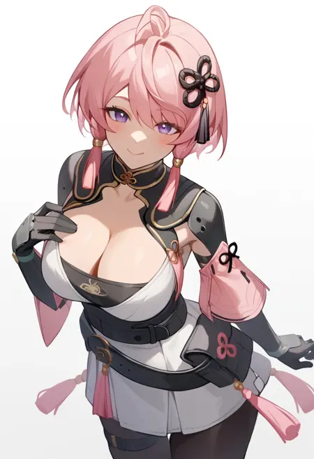 taoqi_(wuthering_waves), 1girl, pink_hair, hair_ornament, hair_over_one_eye, purple_eyes, large_breasts, cleavage, pink_eyes, closed_mouth, ahoge, black_gloves, upper_body, short_hair, tassel