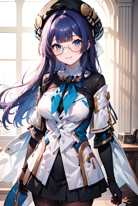 贝雷帽,Pela,黑色手套,黑色头饰,黑色裙子,蓝色眼睛,连衣裙,眼镜,手套,帽子,长发,注视着观众,连裤袜,红色边框眼镜,半框眼镜,无框眼镜,百褶裙