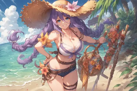 Shizuru,purple hair, long hair, blue eyes, hair between eyes, swimsuit, straw hat, twin braids, belt, necklace, belt, thigh strap,large breast