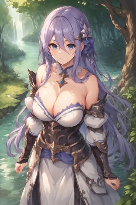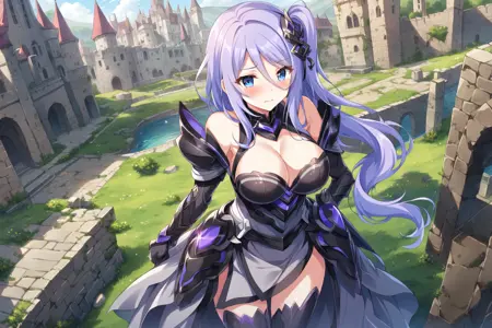 Shizuru,purple hair, long hair, blue eyes, hair between eyes, hair ornament,armor dress, detached sleeves,cleavage,large breast