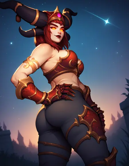 Appearance: AlexBase, large breasts, orange eyes, glowing eyes, red lipstick, gold-lined horns, long eyebrows, tiara,