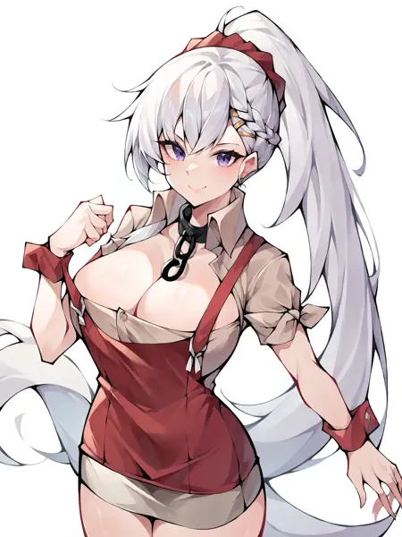 belfast_pizza, 베이지 셔츠, 체인, 칼라, 프렌치 땋은 머리, 헤어 클립, 귀걸이, 낮은 목선, 풍선 꼬리, 보라색 눈, 빨간 앞치마, 빨간 스트랩, 짧은 드레스, 스트랩 슬립, 묶은 소매, 매우 긴 머리카락, 흰색 머리카락, 손목 서포터
