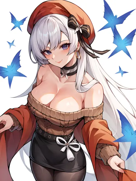 belfast_poki, 베레모, 검은 팬티스타킹, 검은 스커트, 갈색 스웨터, 절개, 하트 핀 귀걸이, 어깨 드러내는 스웨터, 어깨 드러남, 연필 스커트, 슈얼, 은색 머리카락, 매우 긴 머리카락