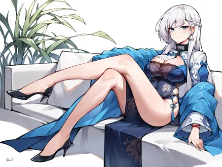 belfast_standart, 프릴 장식이 있는 메이드 에프론, 프릴 장식이 있는 긴 스커트, 흰색 스커트, 파란 눈, 체인, 코치러, 절개, 긴 머리카락, 앞치마 땋은 머리, 파란 메이드 에프론, 메이드 헤어드레스, 흰색 머리카락, 흰색 장갑